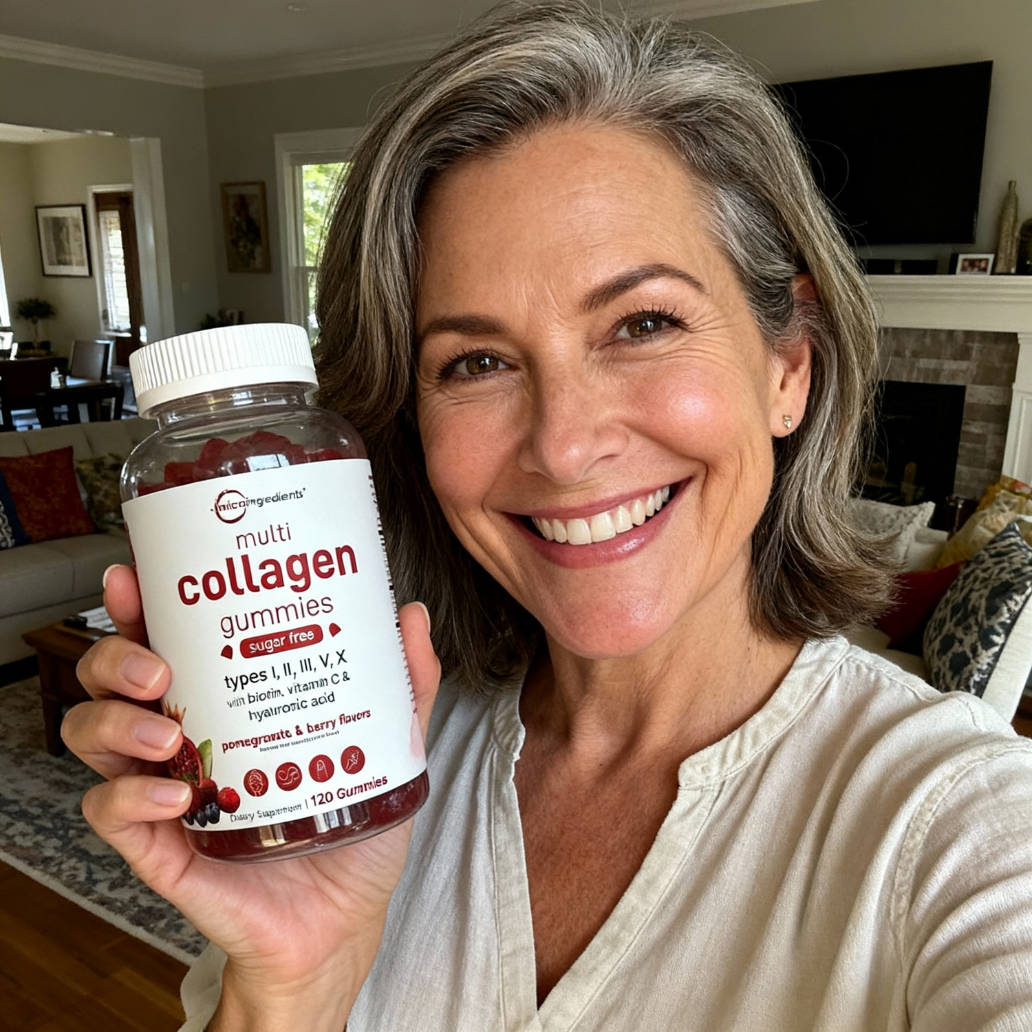 Toma dos gomitas y deja que la naturaleza haga el resto. Nuestra mezcla de multicolágeno te ayuda a reconectar con tu brillo juvenil, el tipo que atrae miradas, aumenta tu confianza y te hace sentir increíble sin ningún esfuerzo extra. Sin rutinas complicadas, sin polvos desordenados. Solo tú, radiante y auténtica, brillando cada día.
